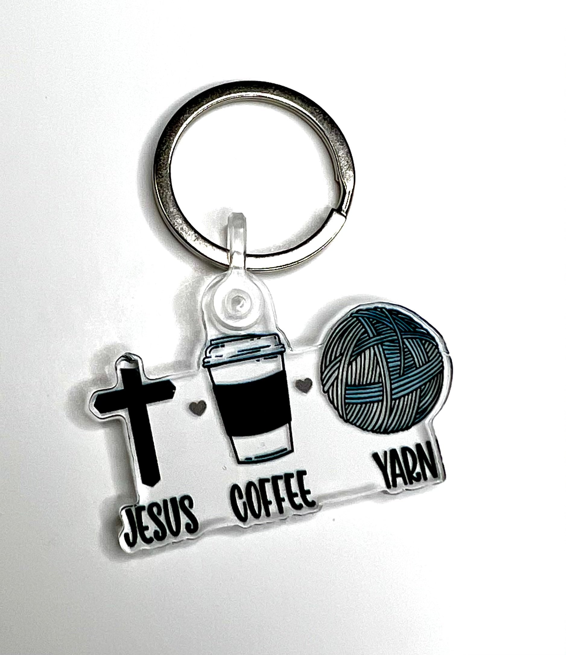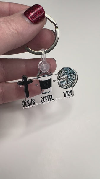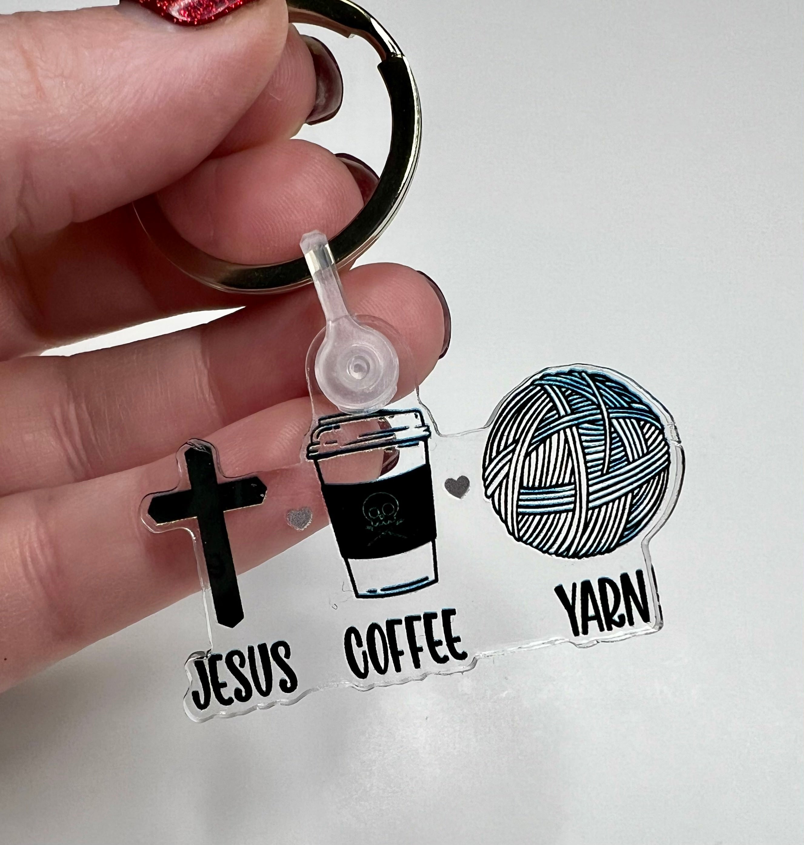 Clip it on your keys, project bag, or tote and keep your favorite comforts close: Jesus, coffee, and yarn.