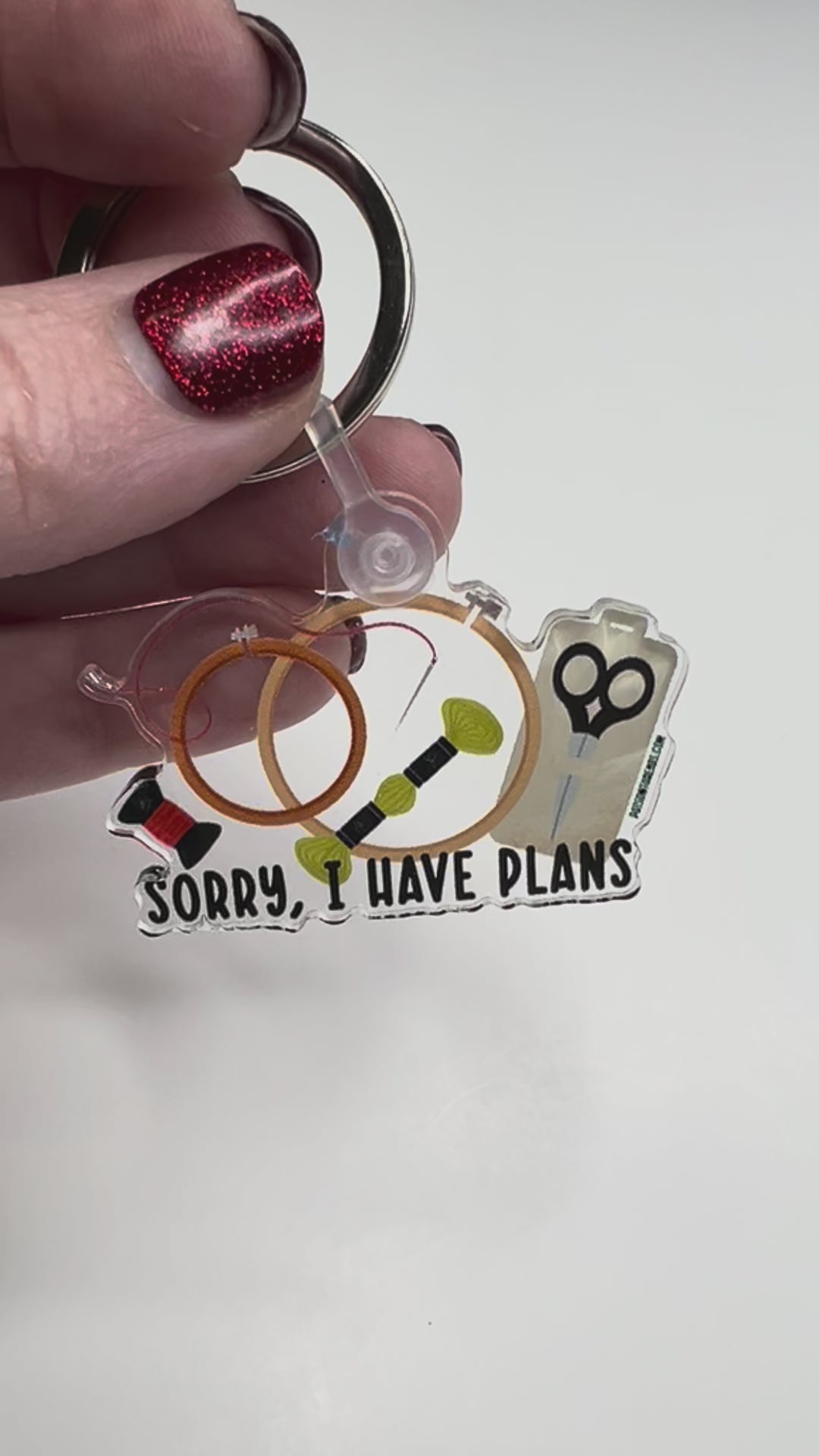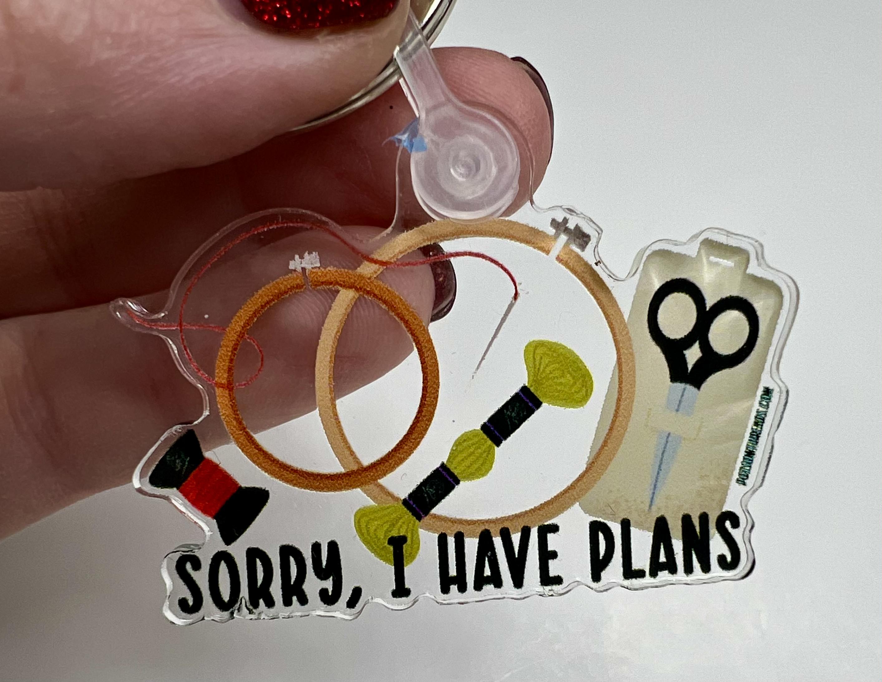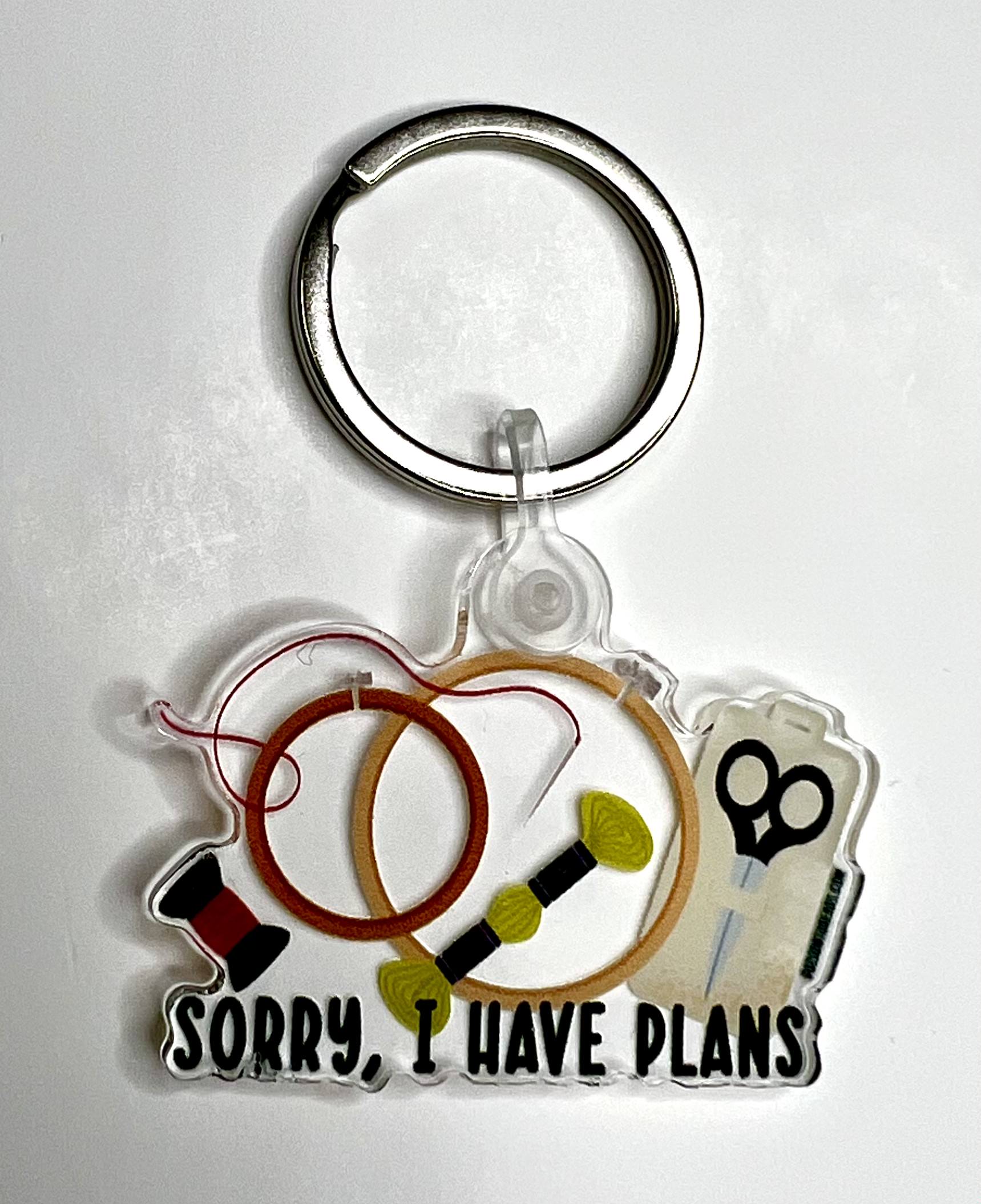 Cancel the plans—your stitching session just became the priority. This adorable keychain features the same beloved design from our “Sorry, I Have Plans” sticker: two embroidery hoops, scissors, and floss, paired with the perfectly relatable phrase.