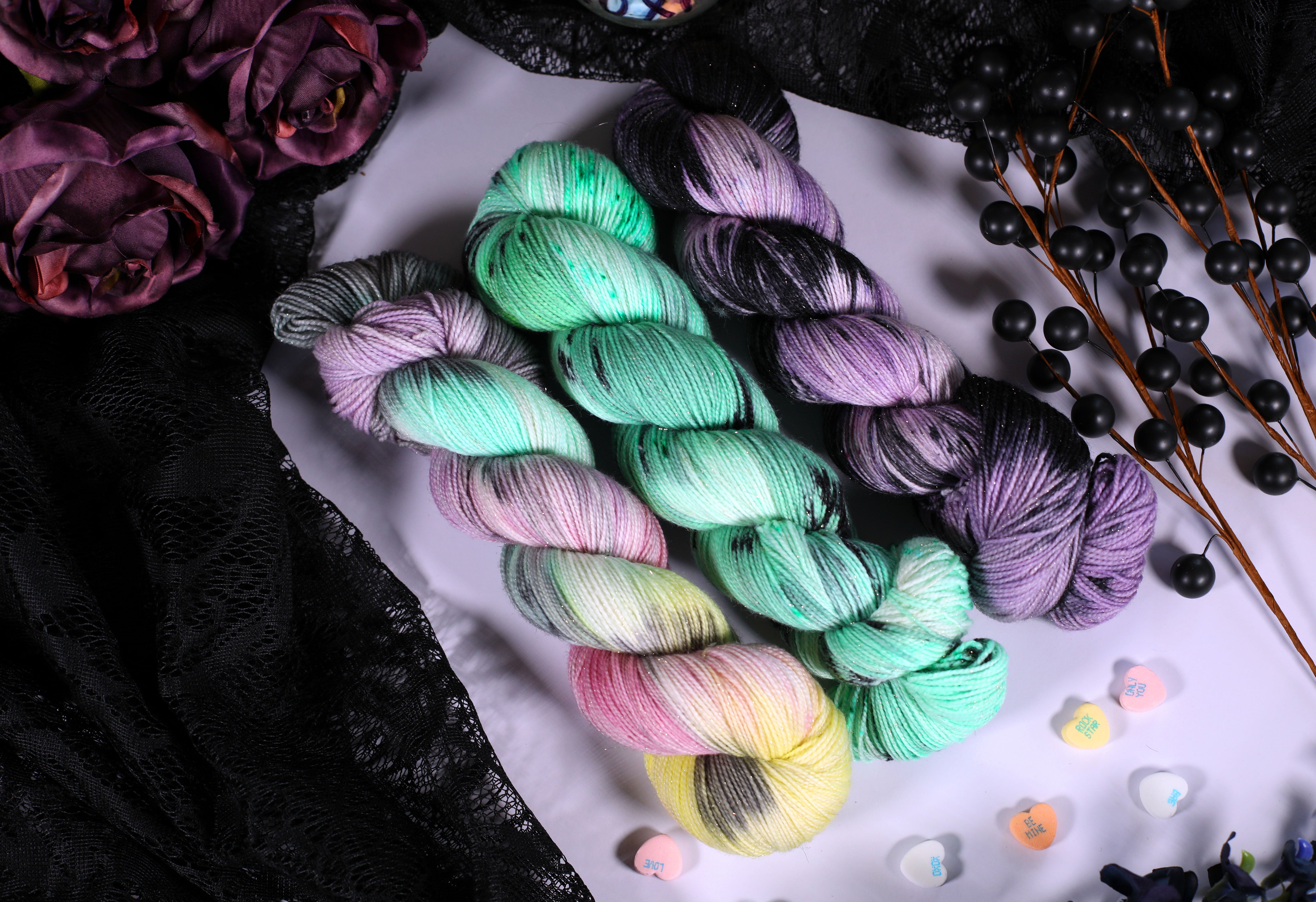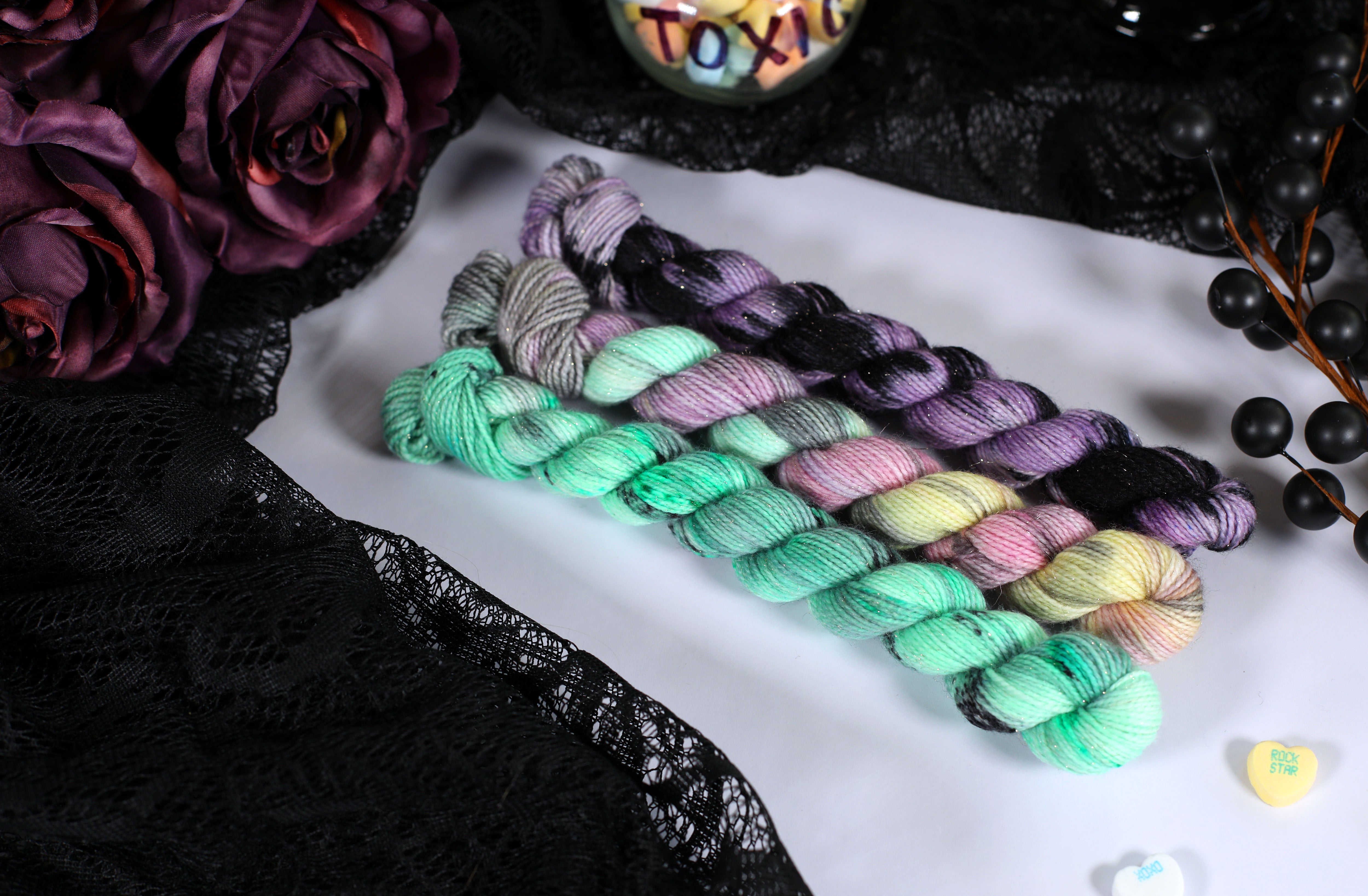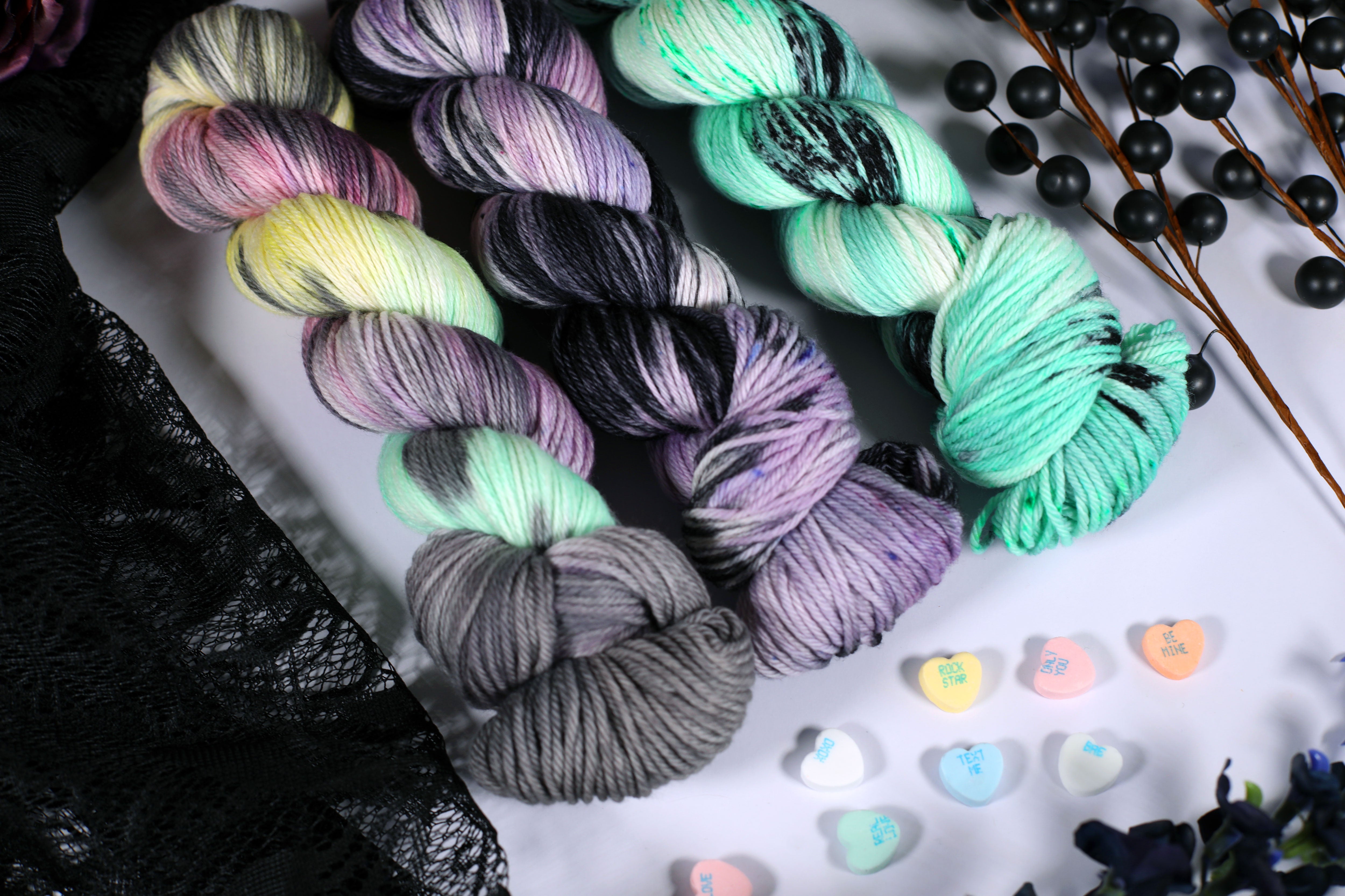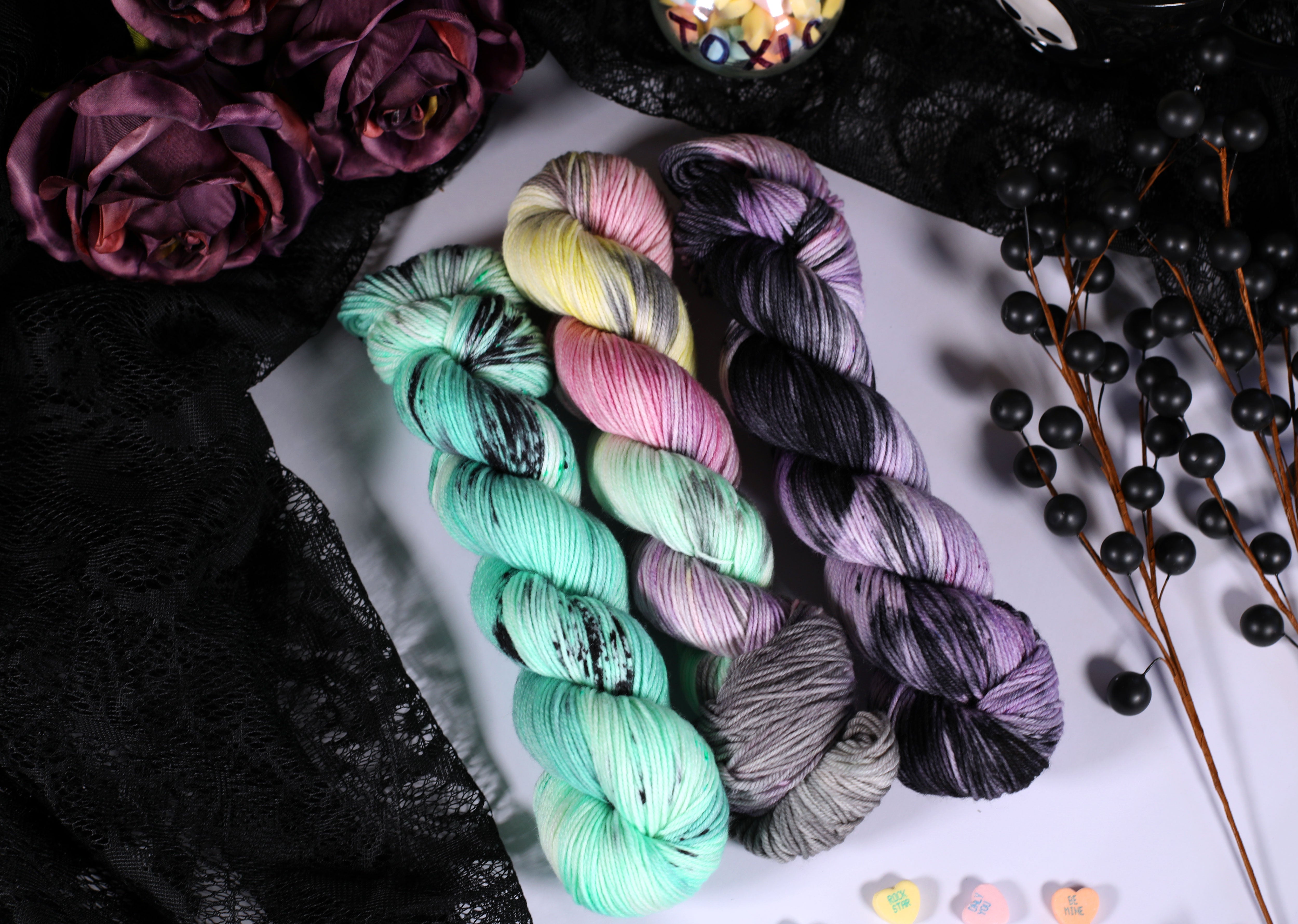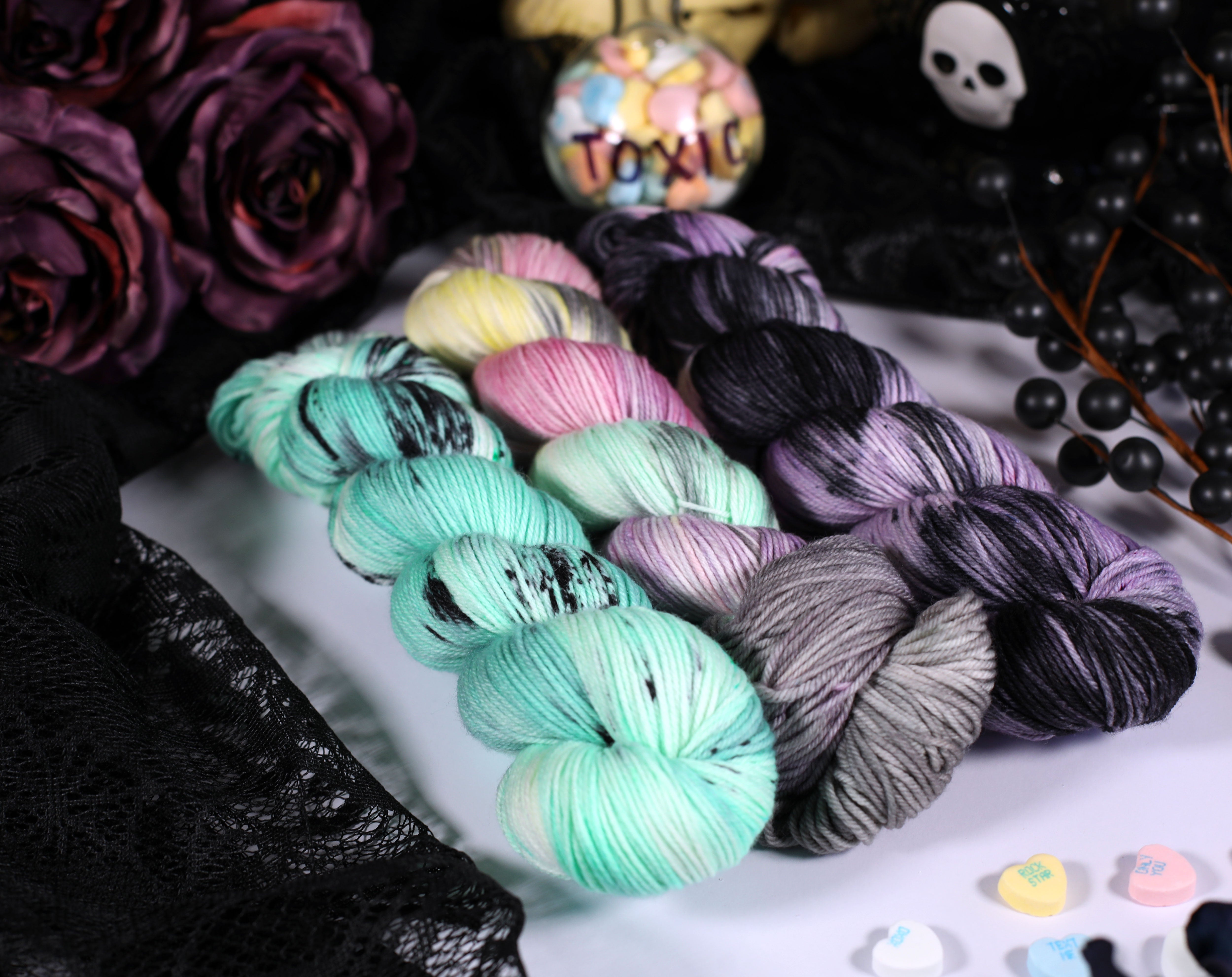 Sweet on the outside, a little bitter underneath — the Toxic Love Collection is inspired by classic candy hearts and the sting of heartbreak. This trio of colorways blends playful pastels with moody contrasts, perfect for projects that toe the line between cute and cutting.