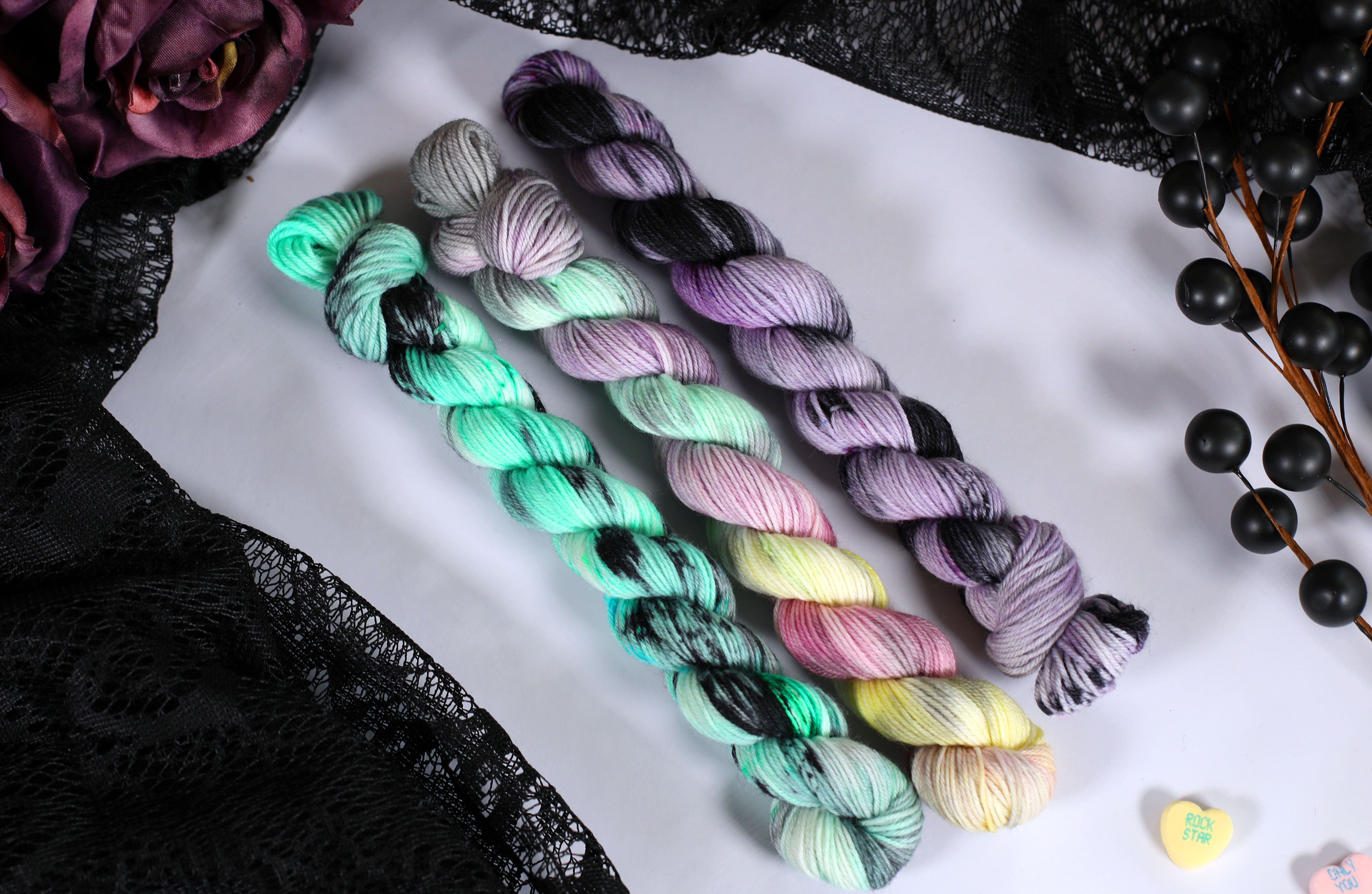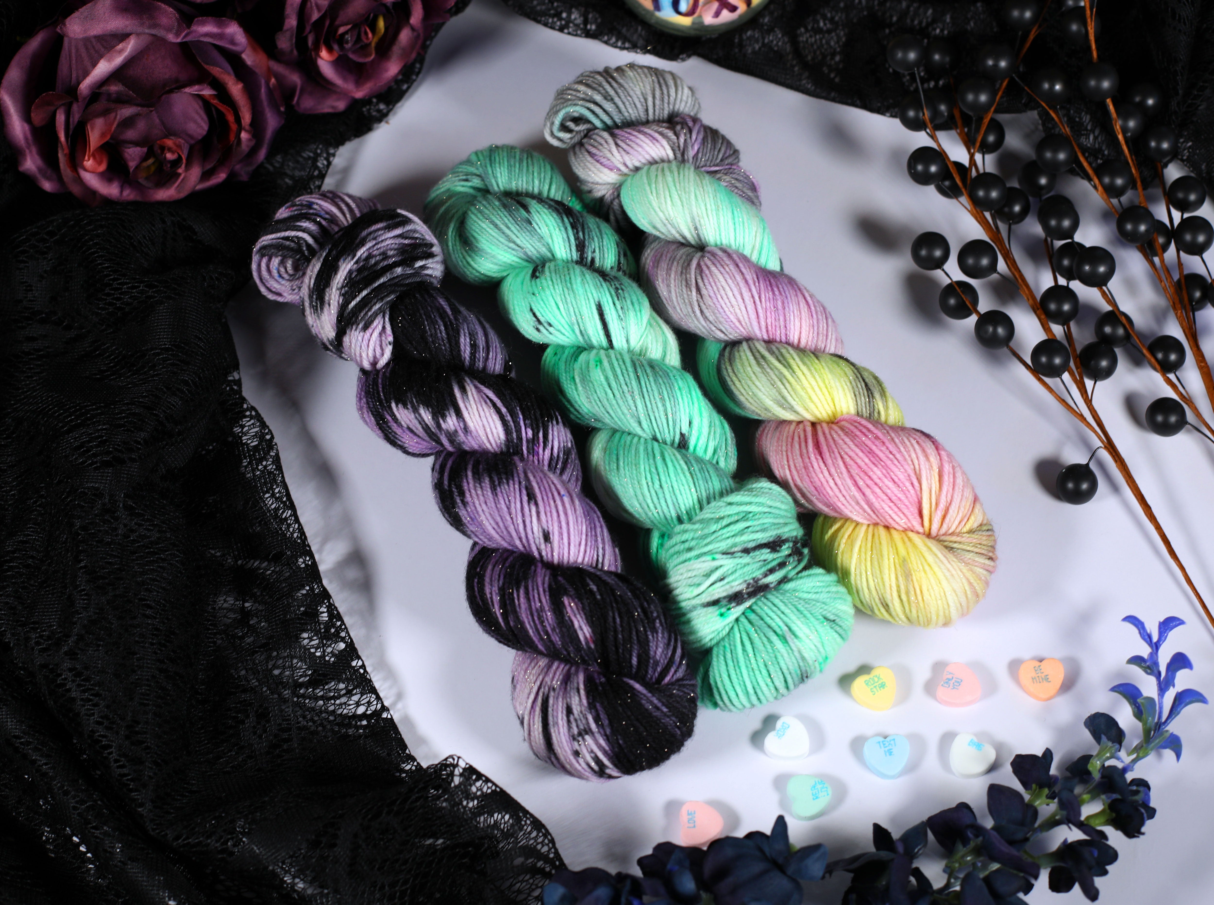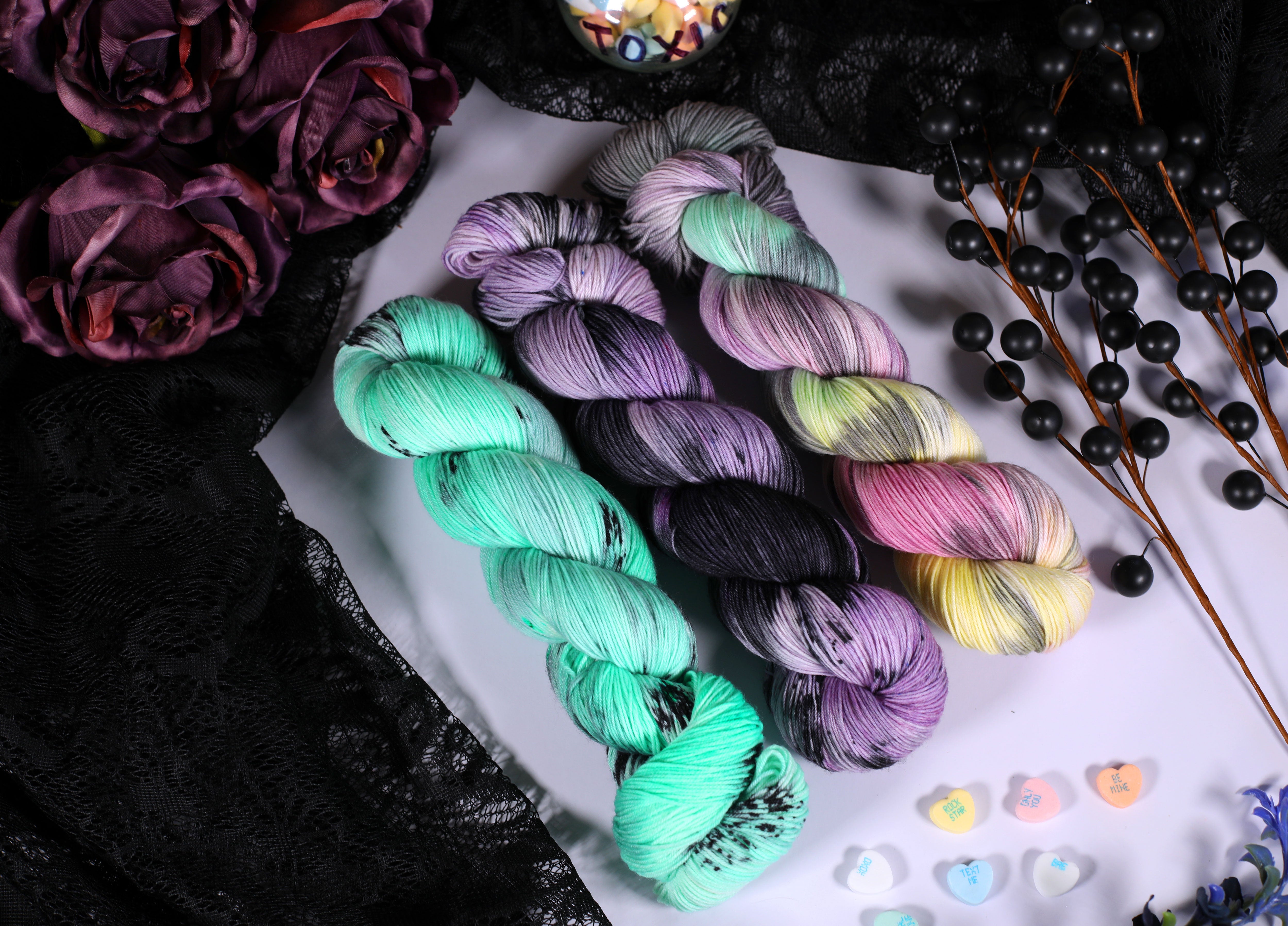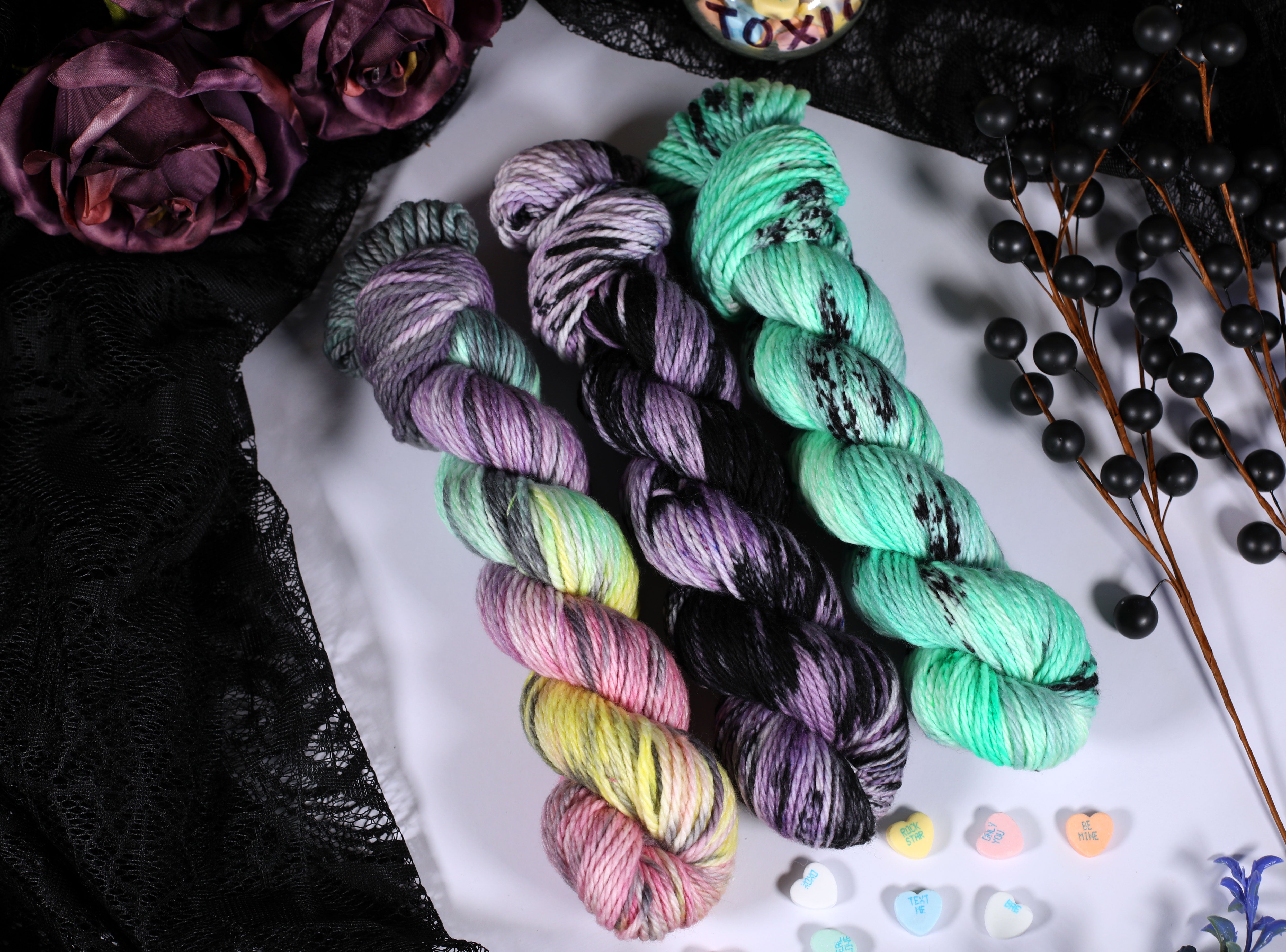 Sweet on the outside, a little bitter underneath — the Toxic Love Collection is inspired by classic candy hearts and the sting of heartbreak. This trio of colorways blends playful pastels with moody contrasts, perfect for projects that toe the line between cute and cutting.