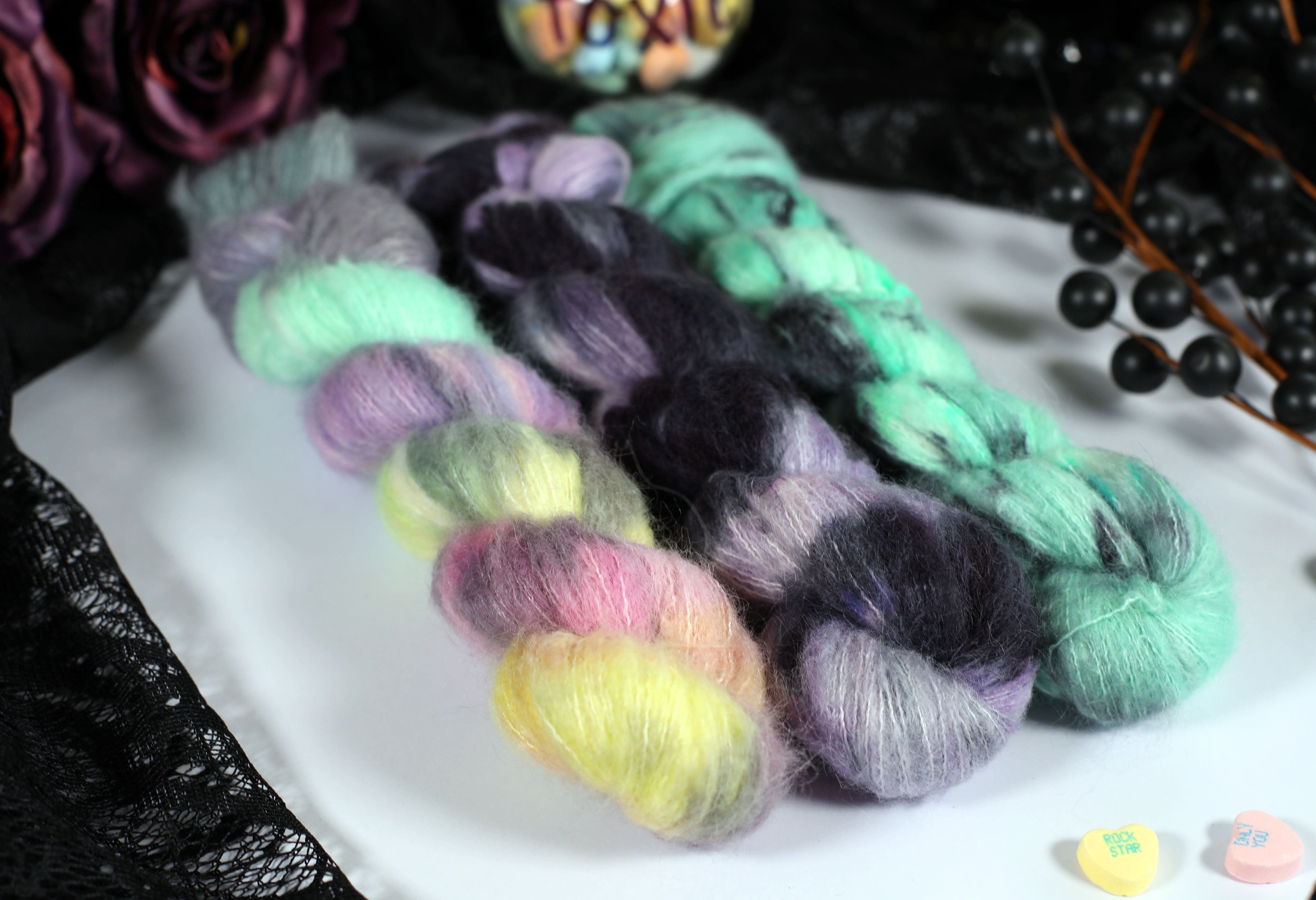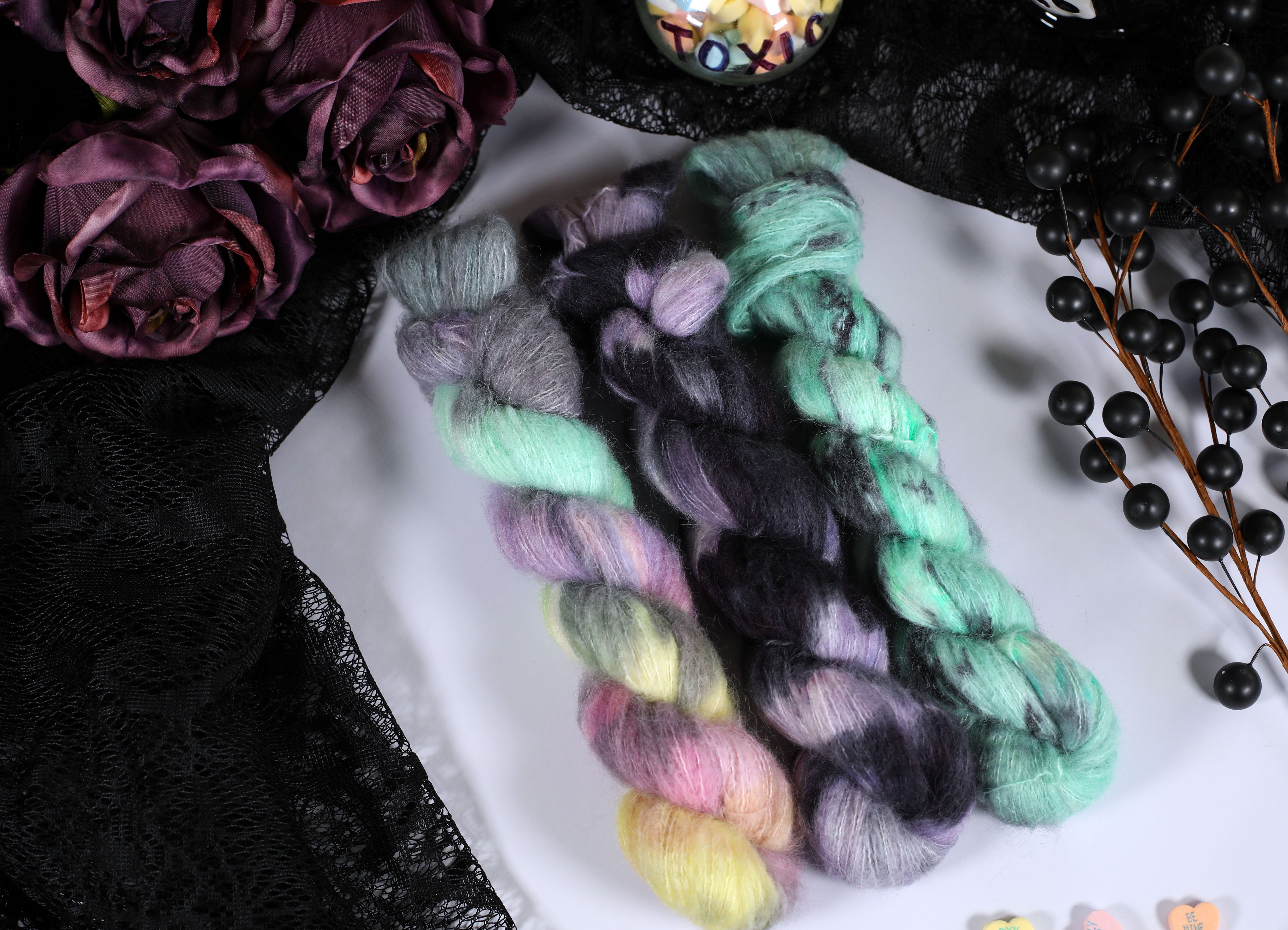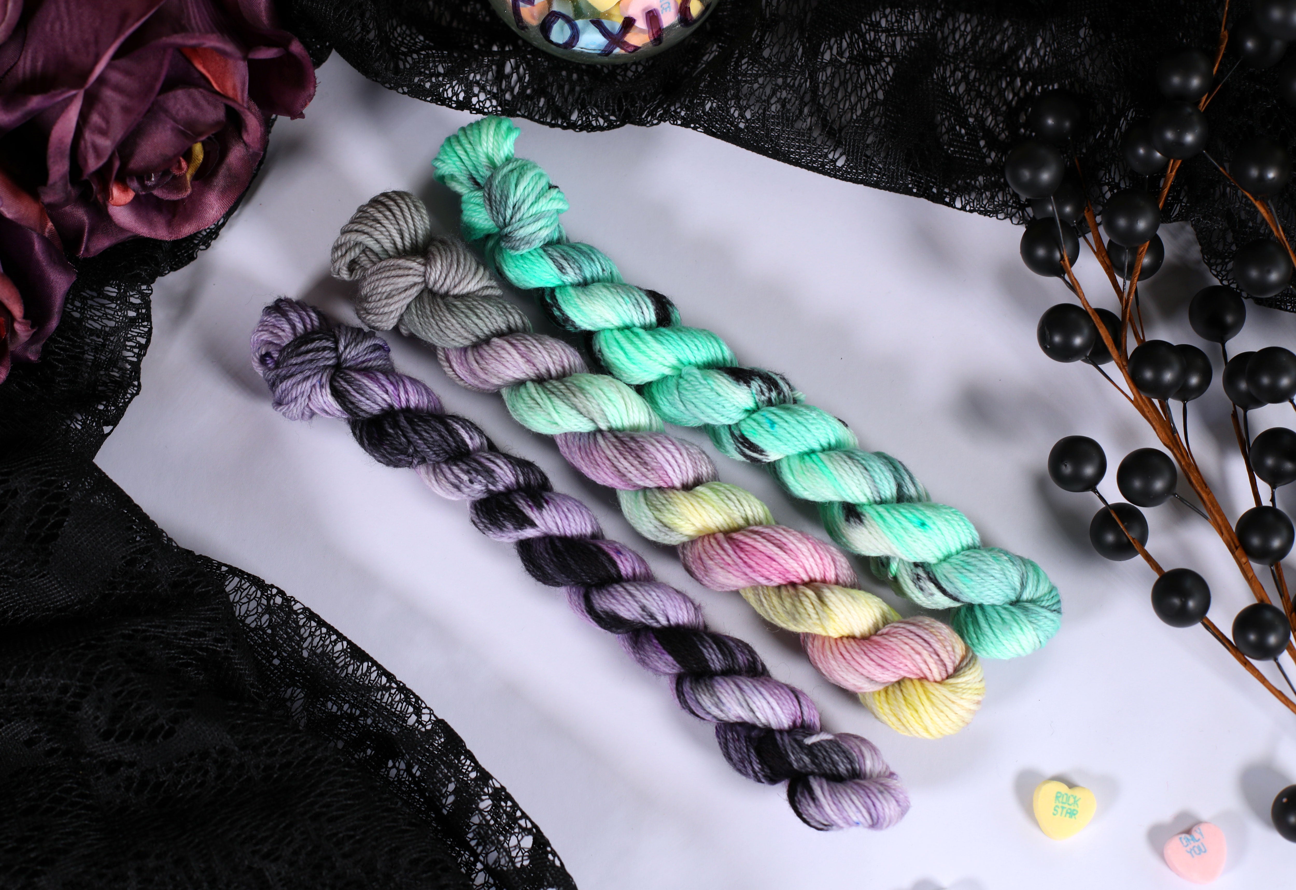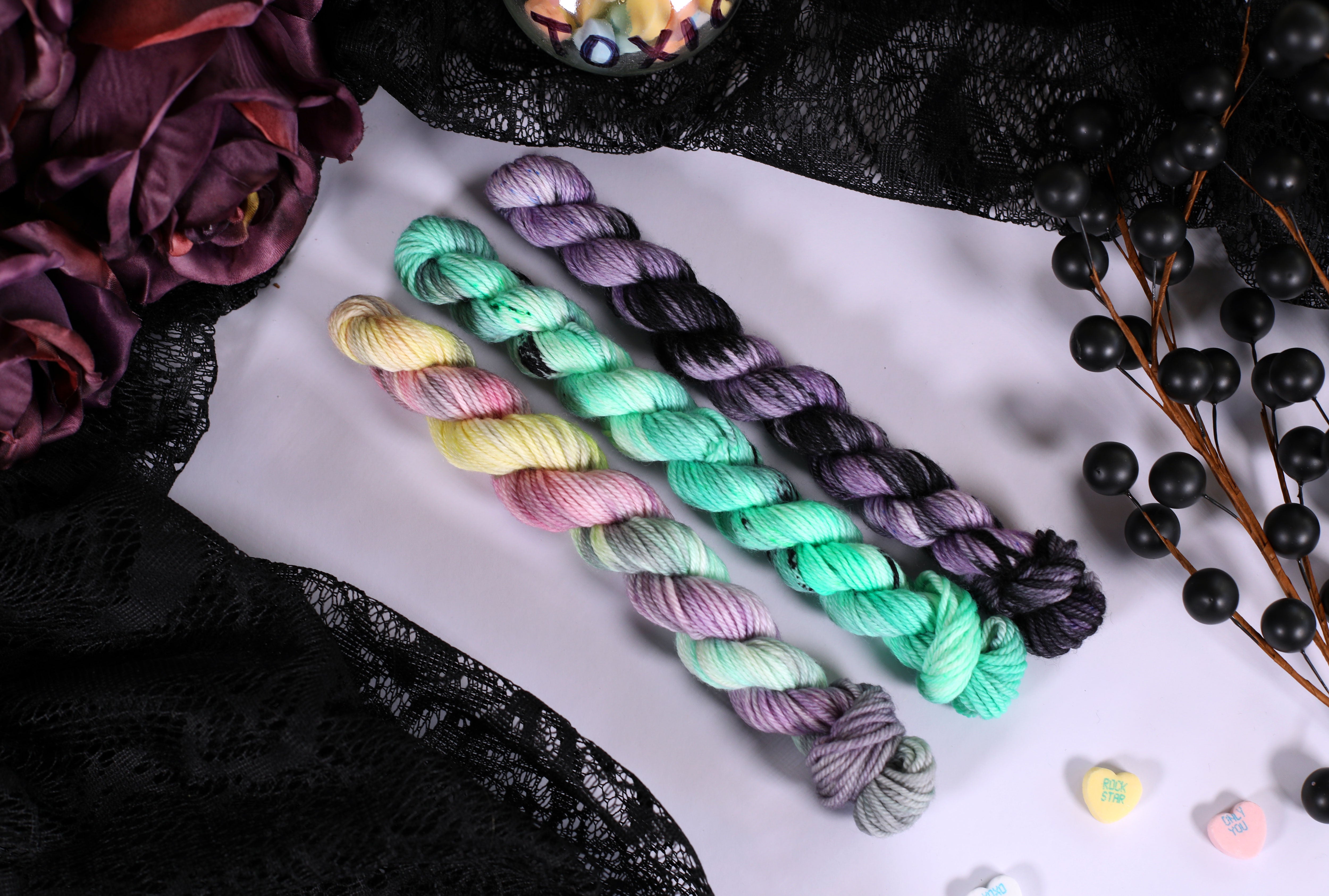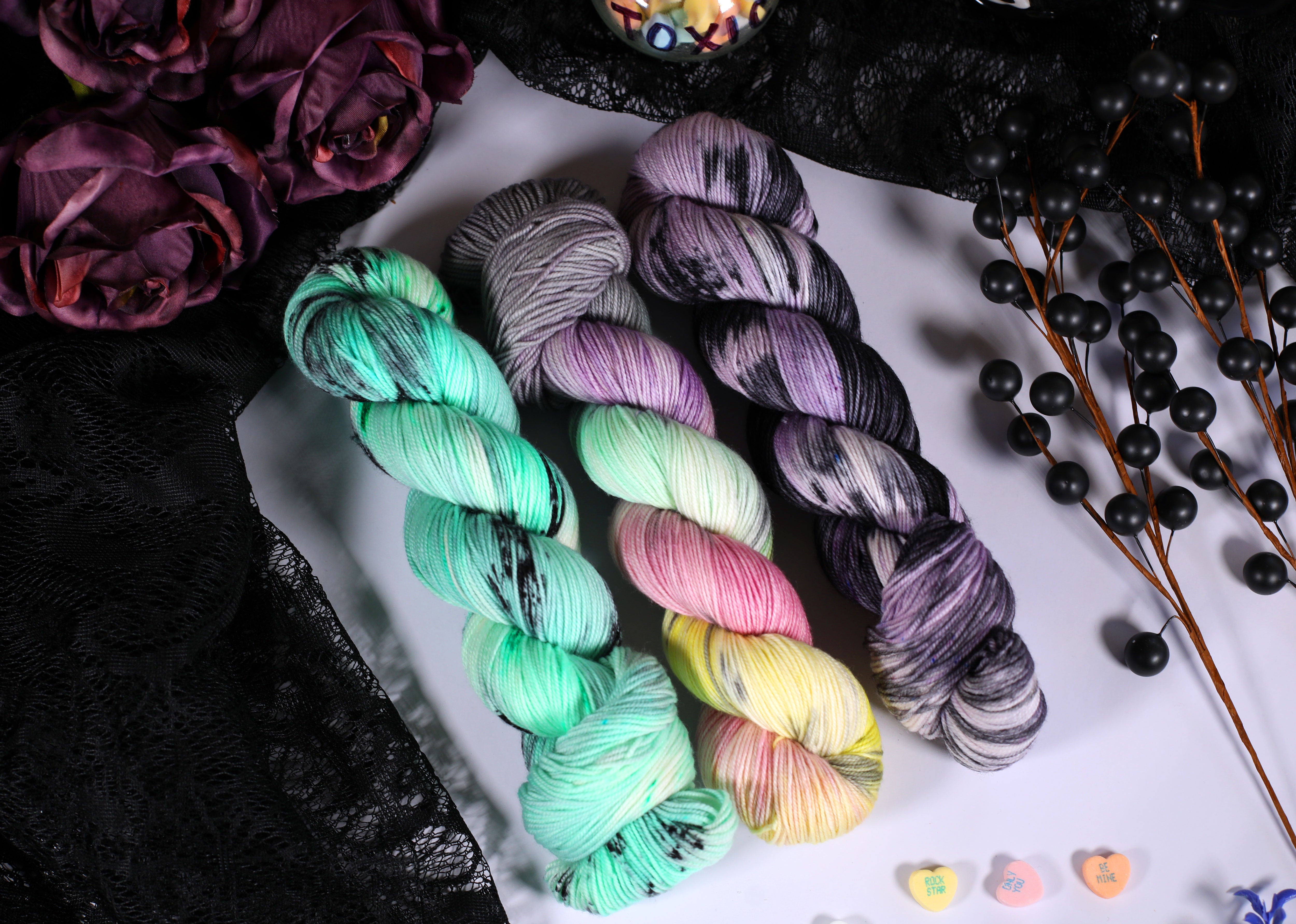 Sweet on the outside, a little bitter underneath — the Toxic Love Collection is inspired by classic candy hearts and the sting of heartbreak. This trio of colorways blends playful pastels with moody contrasts, perfect for projects that toe the line between cute and cutting.